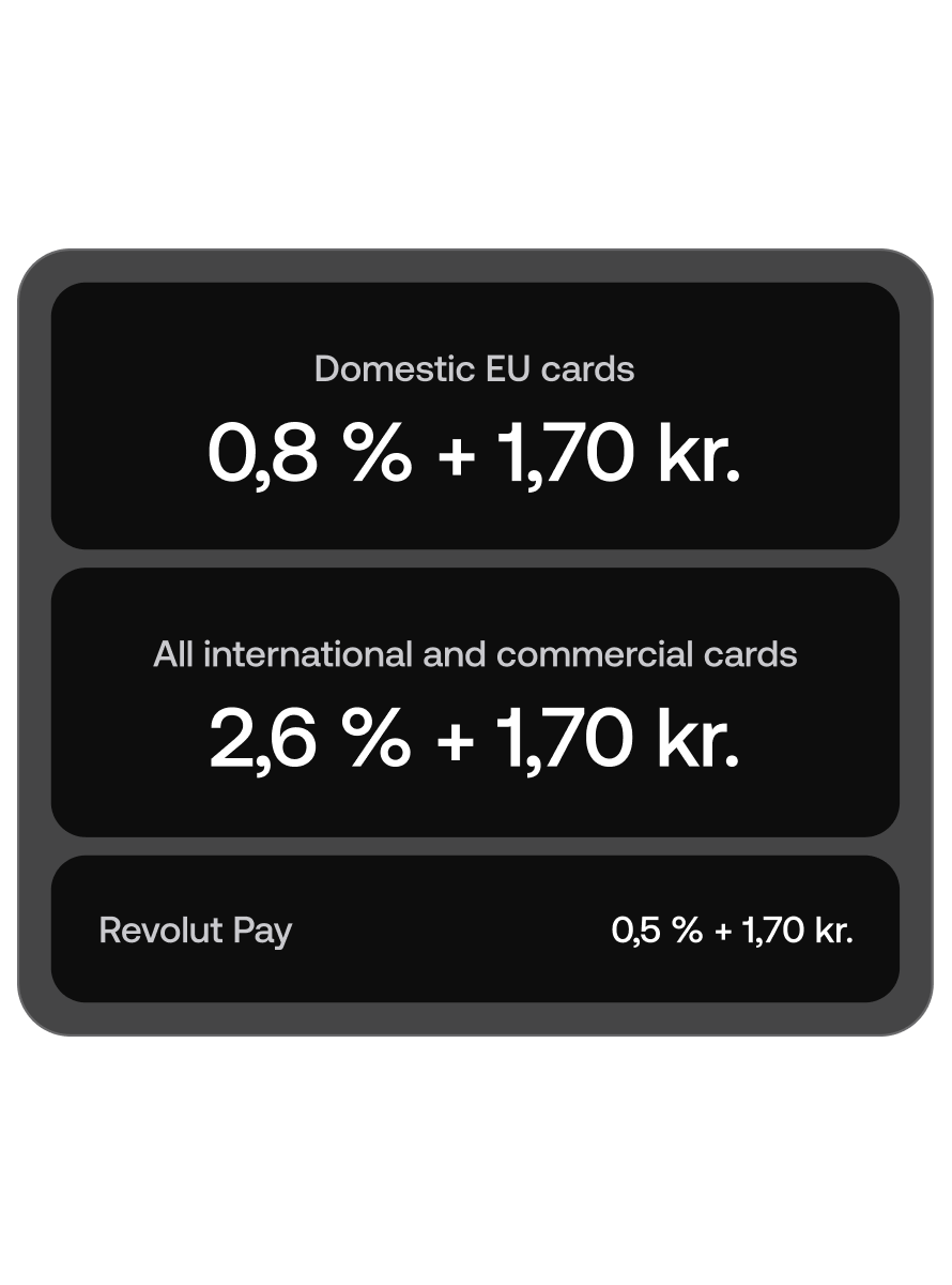 The Revolut Terminal comes at a one-time cost of kr. 2,499 + VAT. No subscription fees or set-up charges. Learn more about payment acceptance pricing.